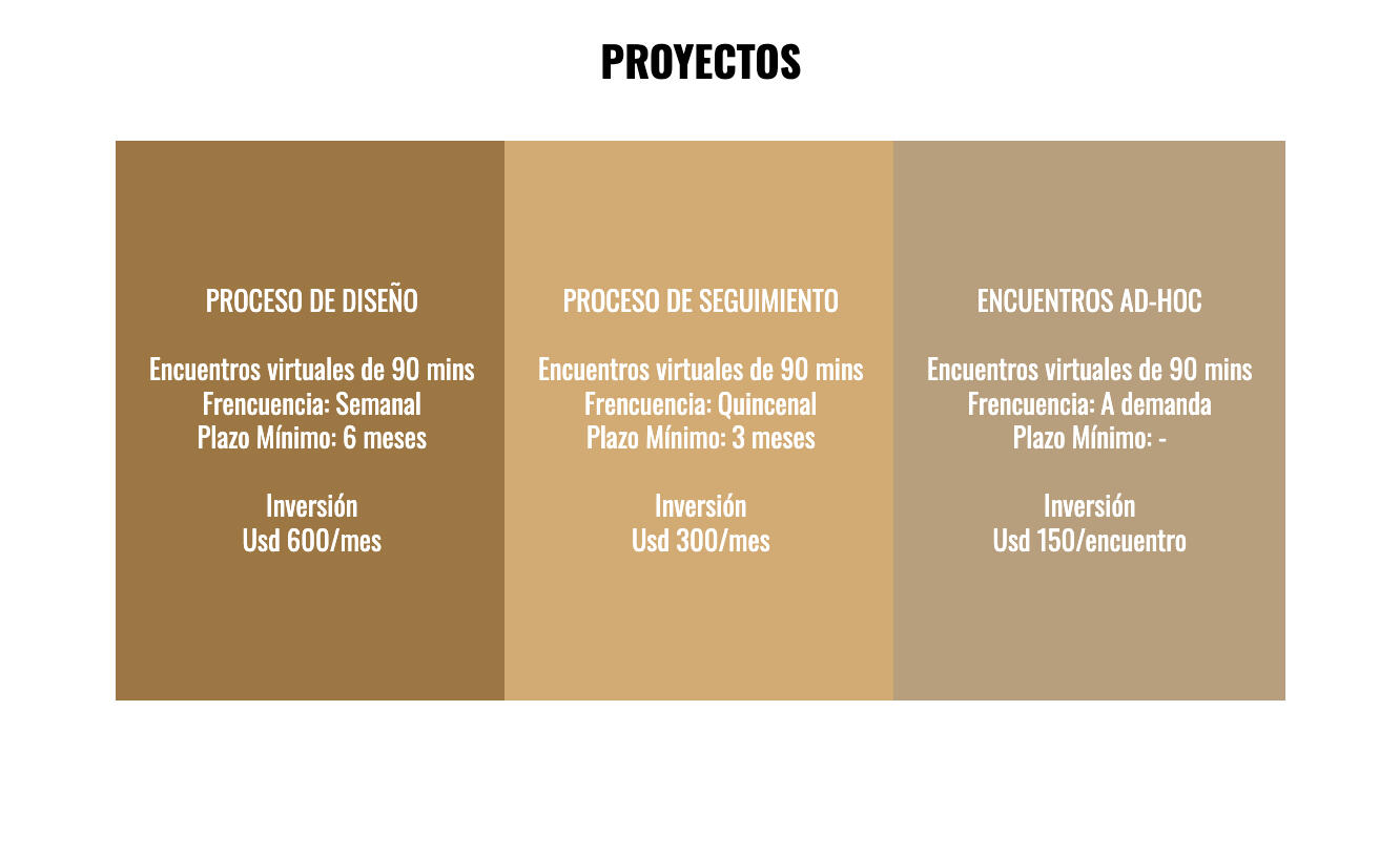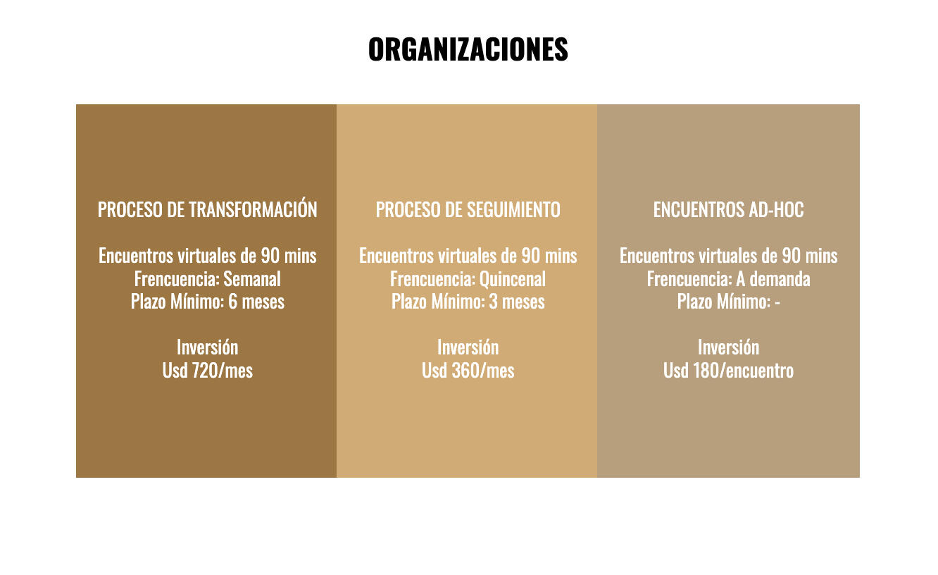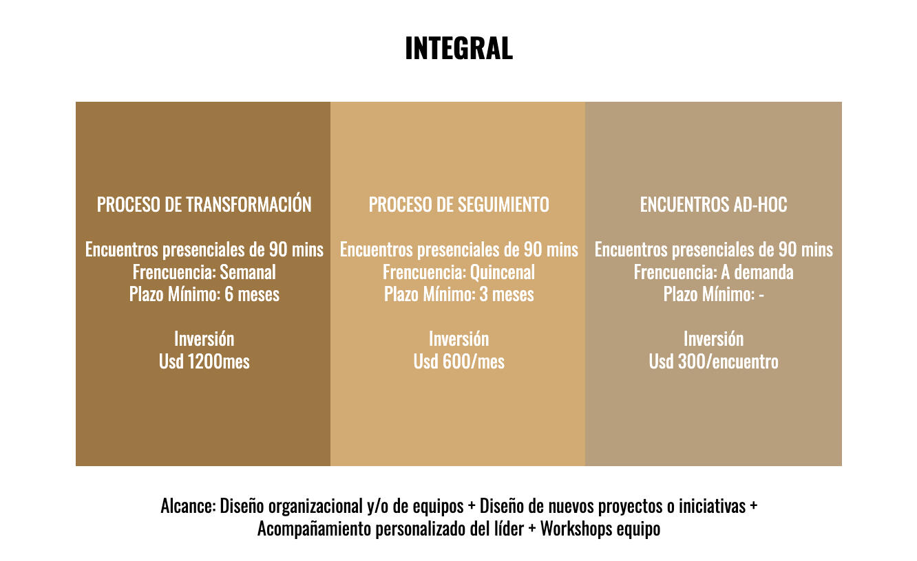 DETALLE DE LOS ENCUENTROS: Las tarifas publicadas en la sección "Planes" corresponden a encuentros virtuales (Google Meet) para los planes "Personas", "Proyectos" y "Organizaciones", y a encuentros presenciales (Rosario Centro) para el plan "Integral". Los mismos tienen una duración estimada de 90 mins y serán individuales, pudiendo extenderse hasta 2 personas por encuentro si el plan de trabajo así lo requiere. Los workshops de equipo, a excepción del plan "Integral", se cotizan por separado.
